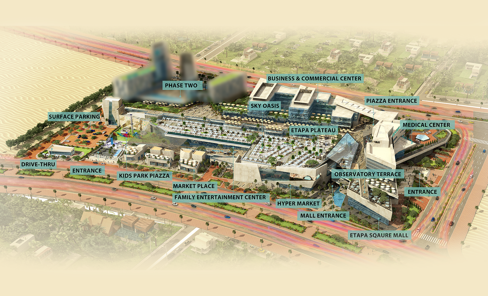 Etapa Square provides a stunning location in the middle of Sheikh Zayed City. Etapa’s land levels also provide amazing views where exceptional lifestyles are a reality. Etapa Square is a mixed use project that includes Business District, Mall, Medical Center, Family Entertainment Center (FEC) and Market Place, all integrated by an innovative concept. On top of Zayed’s City Plateau, Etapa Square is located on a unique site with exceptional topography.The project’s architectural identity is inspired by fragment forms of natural rocks and stones found around the site in irregular patterns, as well as those adjacent to the ancient plateau.The design creates a geometrical rhythm of similar and different interlocking rock forms, creating a cohesive composition inspired by the actual geological processes that shapes rocks in nature.